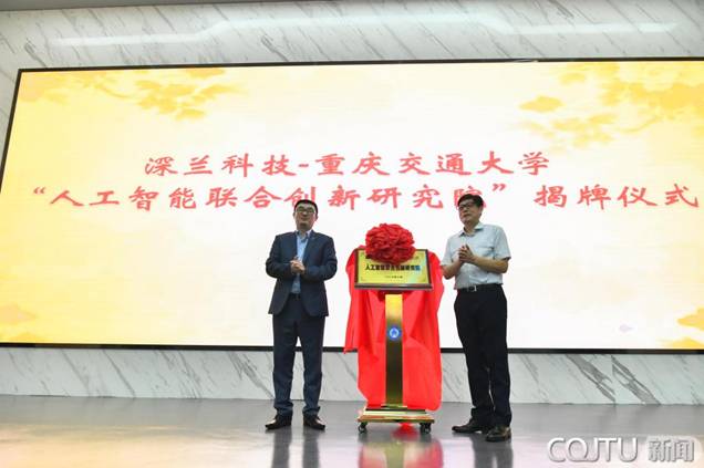 Tang Boming, President ofChongqing Jiaotong University, and Chen Haibo, Founder and President ofDeepBlue AI, unveiled the sign-board of "AI Joint Innovation ResearchInstitute".