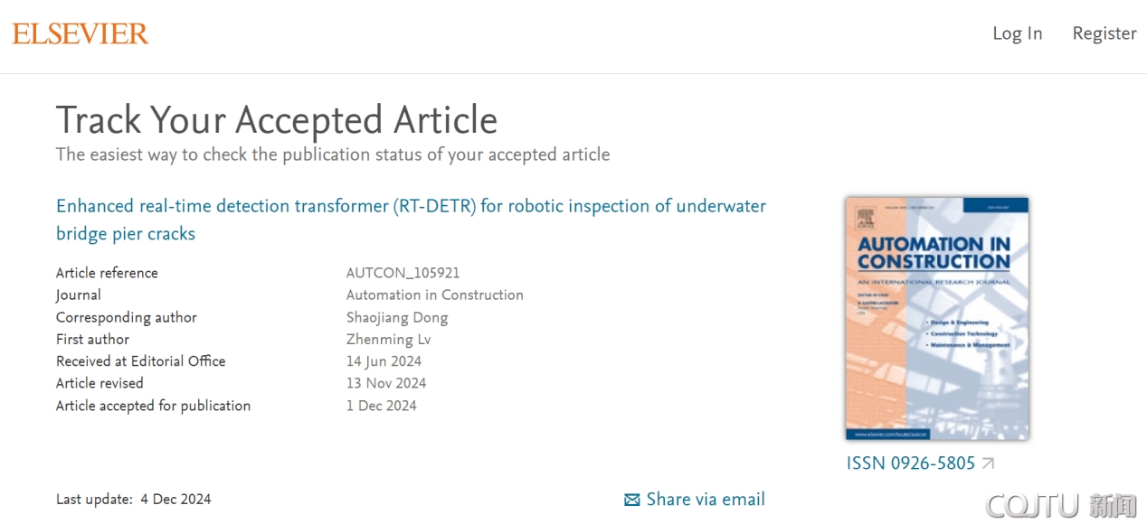 In December 2024, a paper titled “Enhanced Real-Time Detection Transformer (RT-DETR) for Robotic Inspection of Underwater Bridge Pier Cracks” was published in the international top-tier journal Automation in Construction (with an impact factor of 10.3) by Graduate Student Lv Zhenming and Professor Dong Shaojiang from Chongqing Jiaotong University.