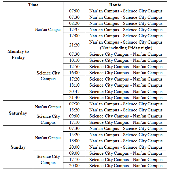 In accordance with the school’s arrangement, the operation time and route of the shuttle bus between Nan’an Campus and Science City Campus are arranged as follows: